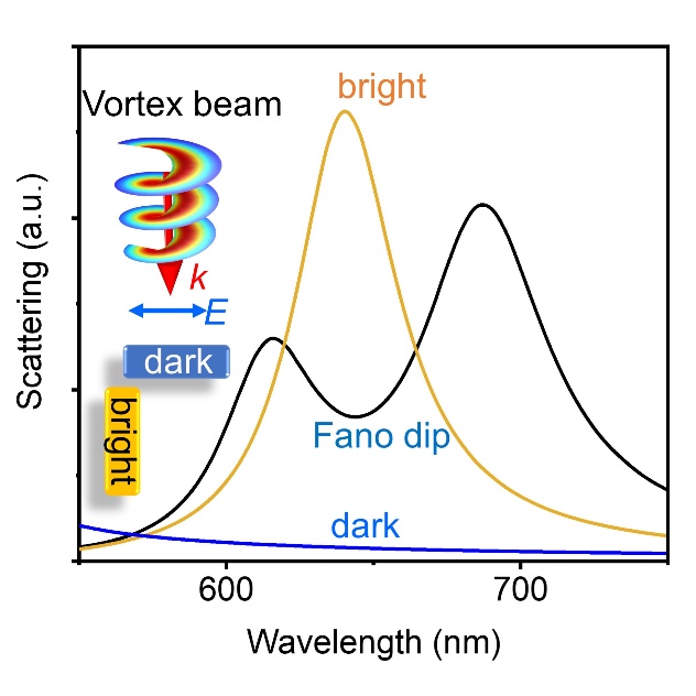 众所周知,平面光中光子的极化是均匀的(uniform),因此位于高斯光束横截面上的具有相同形状的纳米颗粒的振动相位也是相同的,且无法调节的。而轨道角动量光束的相位呈螺旋状梯度分布,位于光束横截面上不同角度的纳米颗粒将具有不同的振动相位,且相位差可通过颗粒间的相对位置和光子轨道角动量量子数进行调节。这些具有不同相位的振子之间将通过近场产生复杂的耦合。这就为研究光与物质的相互作用提供了新的物理自由度,此即为本成果所研究的轨道角动量光源激发下表面等离基元纳米结构间的反常耦合行为。文章发现当自旋角动量和轨道角动量大小相等且方向相反时,可以实现沿光传播方向的表面等离基元电偶极激发。并且轨道角动量光源激发下,两个等离激元偶极子可呈现“头对头”反键耦合和“肩并肩”成键耦合态激发,这与传统的耦合态激发行为截然相反。此外,文章还观察到纳米棒二聚体的反常Fano共振:沿光传播方向的纳米棒为明态,沿电场方向的为暗态,这与传统的Fano共振正好相反。