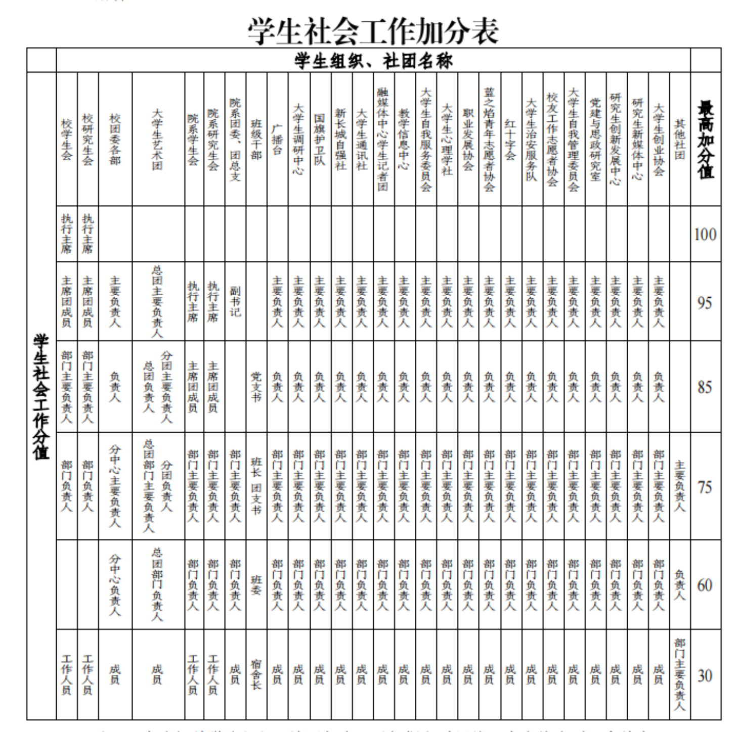 4. 上表加分规则对应以班级为单位的党支部,班级党支部中其他委员按照班长、团支书的加分标准计算学生社会工作分值;以为年级为单位的党支部或纵向党支部,党支部书记(副书记)按最高加分值 95 分计算,党支部其他委员按最高加分值 85 分计算。
