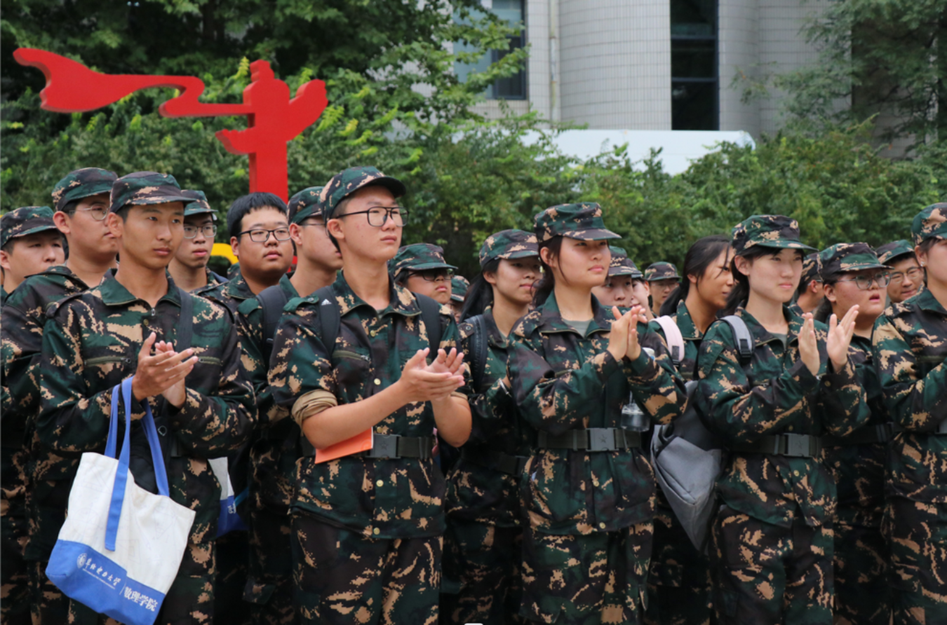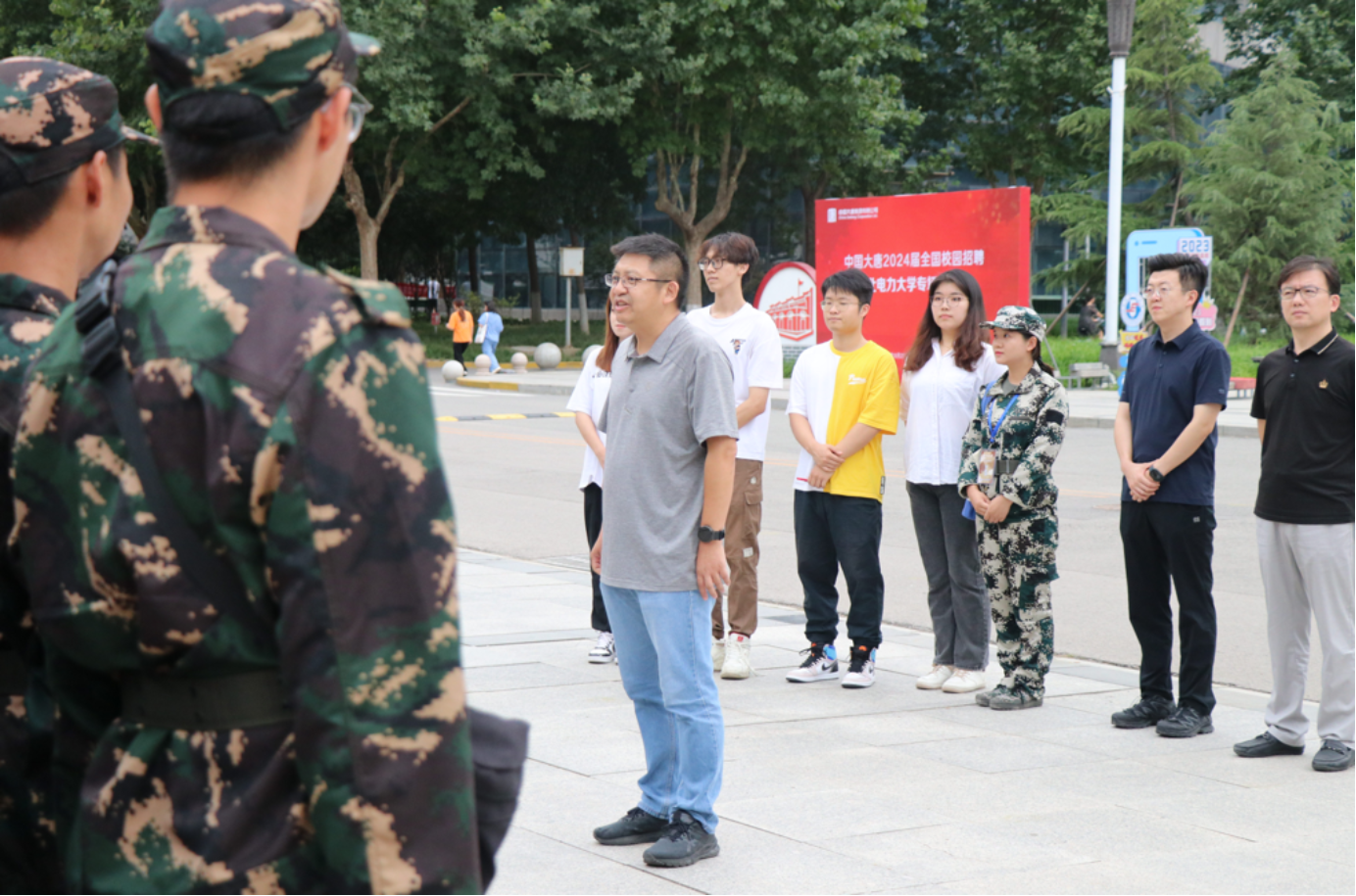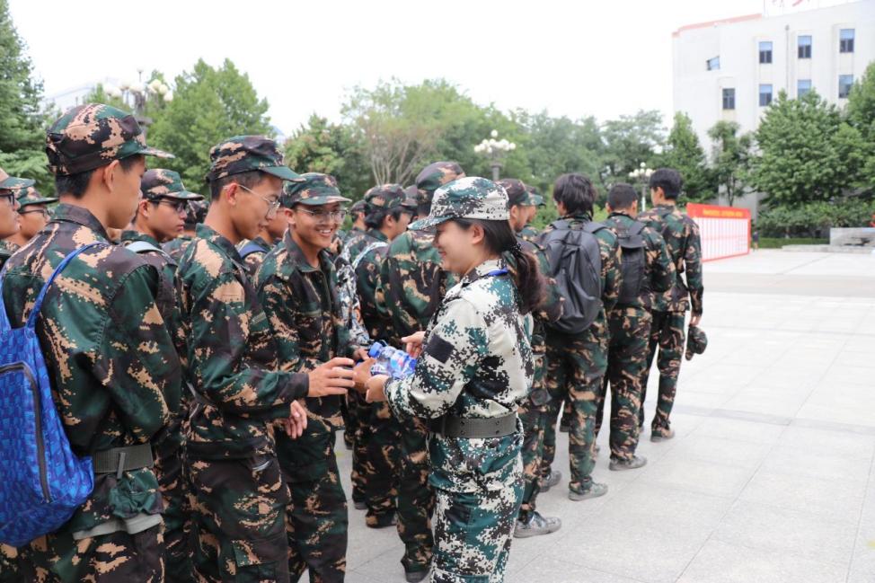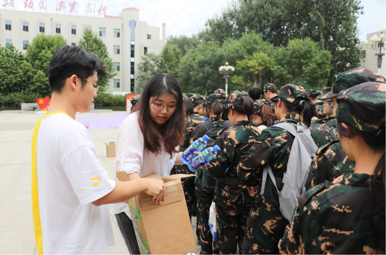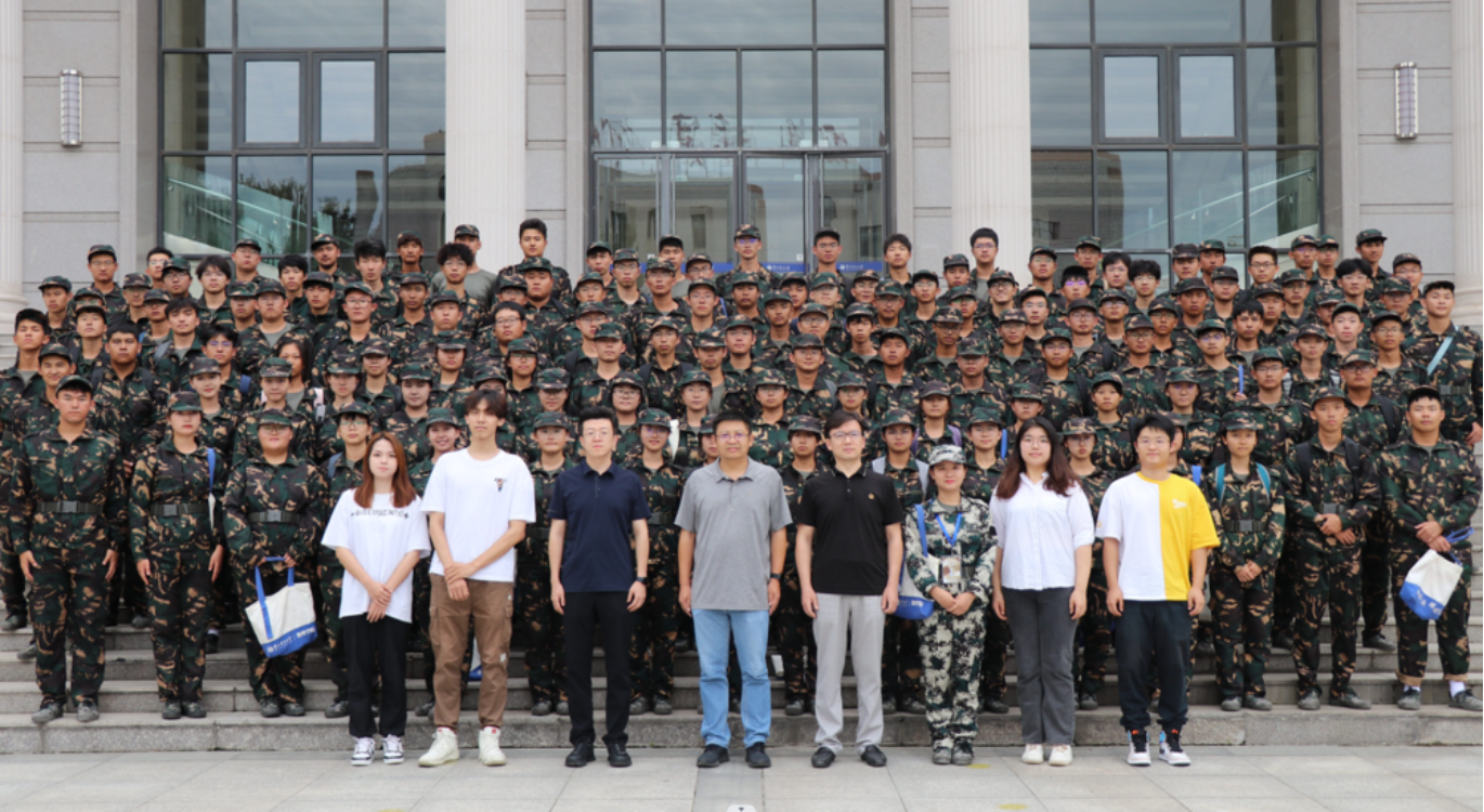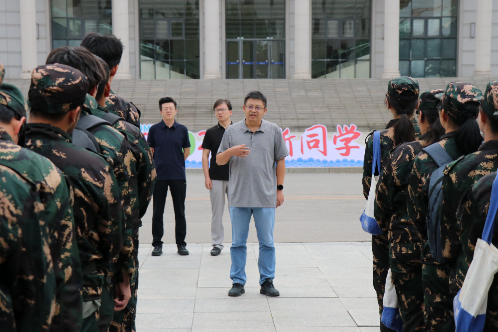 党委书记包小勇、党委副书记林林、团委书记王炜、2023级辅导员宋金溪及团学代表于学校主楼礼堂前慰问正在军训的2023级新生,以勉励刻苦军训的2023级全体新生。